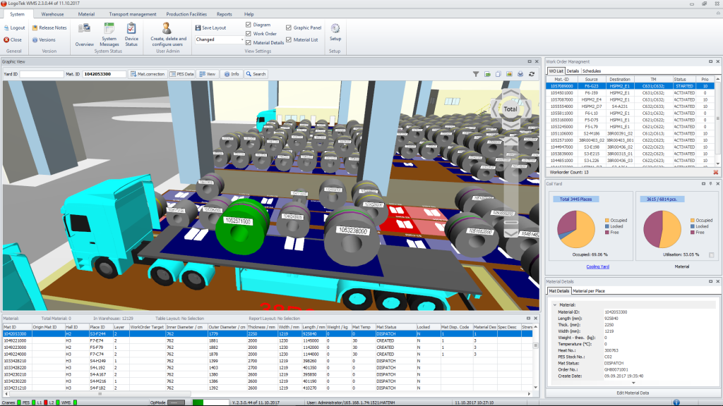 LogoTek warehouse management systems LTWMS are suitable for the material management in different industries, with special focus on heavy industries/metal. The operator can get data about material movements, storage yard occupation and crane operational status. Work orders for cranes and other means of transportation are generated on basis of production planning data. Statistical information of storage yard status is available. A crane tracking system for transport monitoring, or a complete automation system can be integrated into the WMS. In this case the storage yard image is updated on basis of process data received from the cranes. The selection of storage yard locations is performed on basis of optimization rules and restrictions.